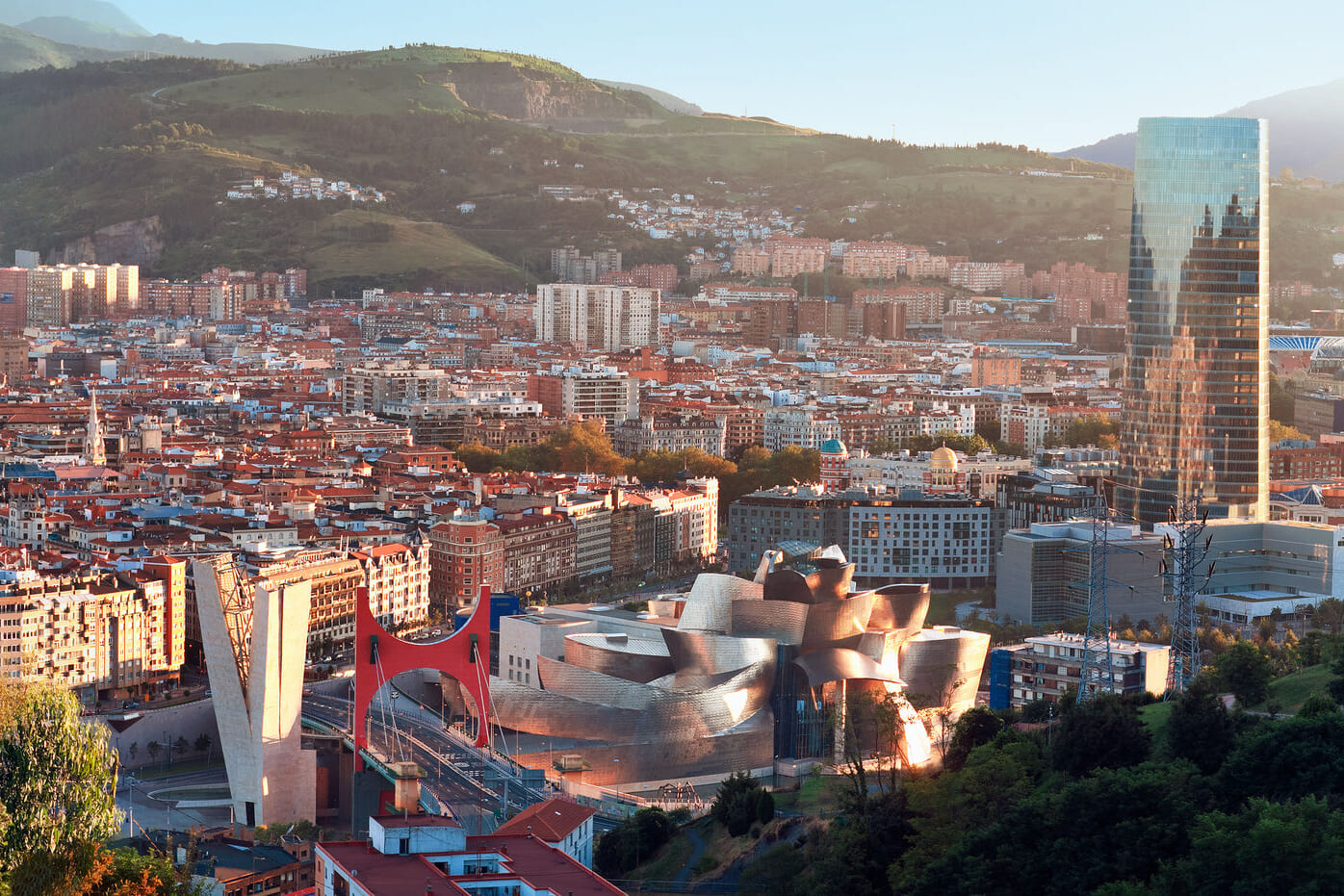 バスクには 3 つの個性的な都市があります。人口が最も多いビルバオ市は工業都市として発展した後、近代都市へと変貌を遂げた街です。市街地には、ネルビオン川が流れています。かつては貨物船が出入りしていた川のほとりに、グッゲンハイム美術館が建っています。渋い光を放つチタンに覆われた近代美術館は船のかたちをしており、造船業や商業港として栄えた街の歴史を語り継いでいます。旧市街地の古い町並みやバル街、川沿いの市場を散策したら、ケーブルカーでアルチャンダ山へ登り街を一望しましょう。