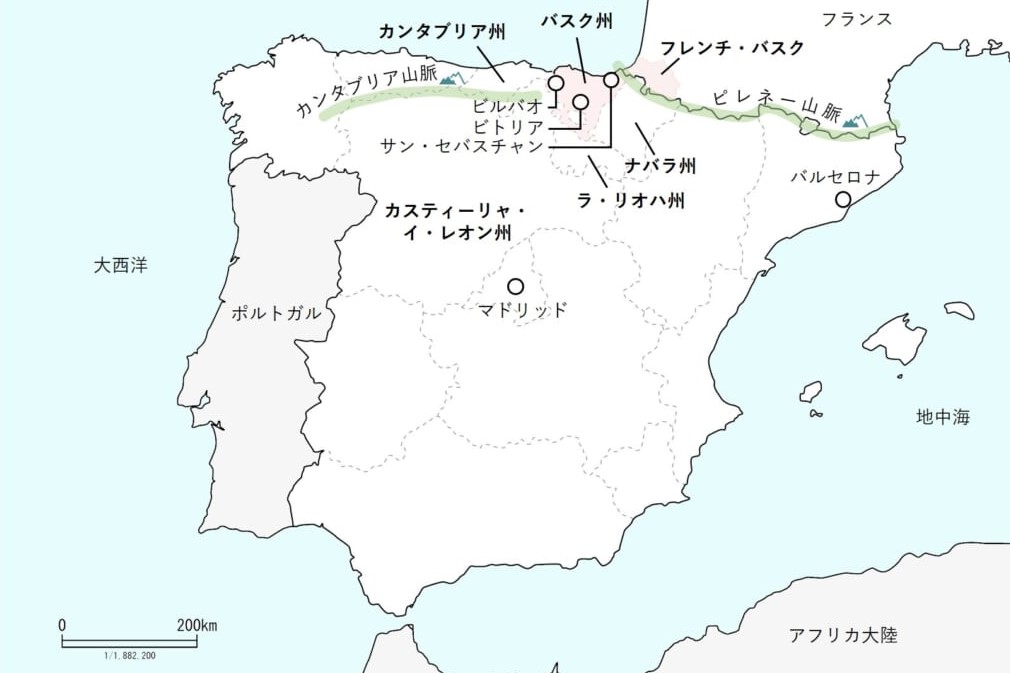 バスクはスペインに 17 ある自治州の一つです。イベリア半島の北部に位置しており、大西洋に面したビスカヤ県とギプスコア県、内陸のアラバ県の 3 県から構成されています。州都はアラバ県のビトリア=ガステイスです。ここ数年、世界で注目を集める美食の町サン・セバスチャンはギプスコア県、ビルバオはギプスコア県のそれぞれ県都です。